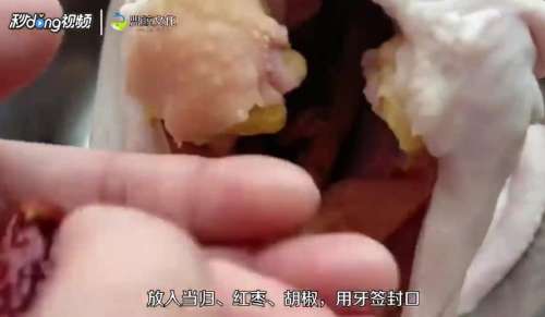 3将洗干净的鸡塞到猪肚里面,放入当归,红枣,胡椒,用牙签封口。