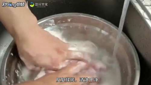 1猪肚中加入面粉,加点清油,反复揉搓,清洗干净。