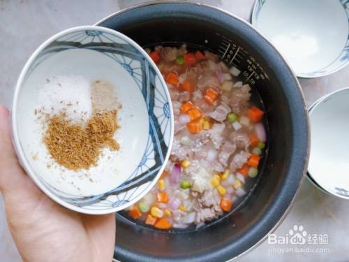 将盐、白胡椒粉、十三香粉、孜然粉、糖也加进去,再加入一些水和生抽,直接搅拌均匀。