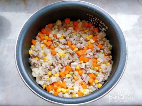 接着是将胡萝卜切成小丁,土豆去皮后切成小丁,洋葱丁可以稍微切的大一点,另外还要准备好青豆和玉米粒
