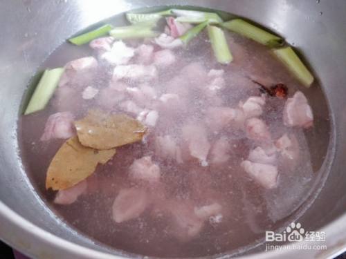 另外准备一个小锅,倒入冷水,加入香料,搅拌均匀,再将切好的羊排倒进去,直接煮开。将表面的浮沫捞出去