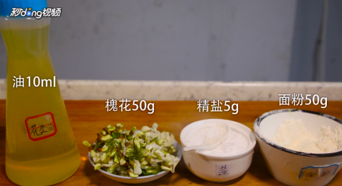 准备材料:油10毫升、槐花50克、精盐5克、面粉50克。
