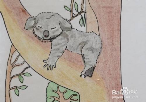 黑色勾线笔画出桉树树干表面的树皮纹理,蓝色彩铅画笔为天空上色。粉色彩铅画笔为考拉的嘴唇上色。