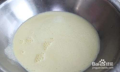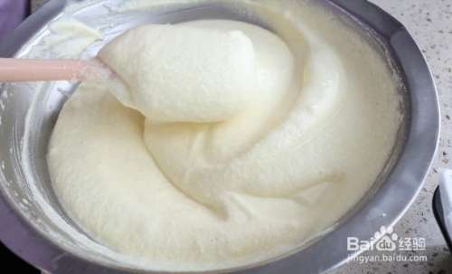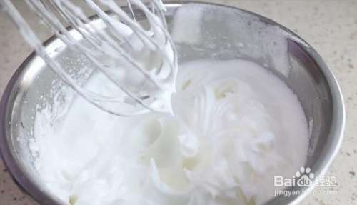 蛋白里加入30克白糖,把蛋白打发,打发到提起冒尖不掉落的状态。