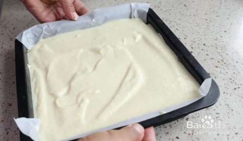 容器里倒入蛋糊,用铲子摊平,再端起容器两边,用力震动几下