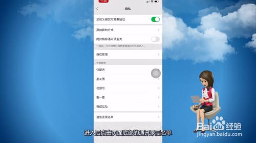 进入设置页面后点击隐私设置一栏,进入后点击页面底部的通讯录黑名单。