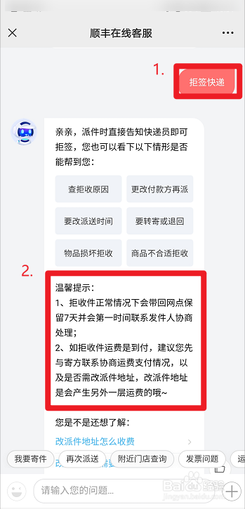 进入客服对话框后,在对话框中输入“拒签快递”,客服回复如下:如拒收快递运费是到付,建议您先与寄方联系协商运费支付情况,以及是否需改派件地址,改派件地址是会产生另外一层运费的。