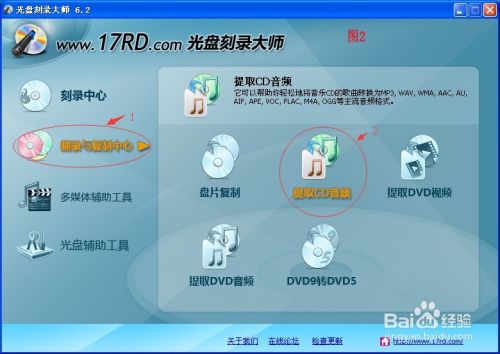 安装好音频提取软件以后打开软件,如图2所示,我们将鼠标移动到“翻录与复制中心”的位置,就可以看到“提取CD音频”的按钮,点击此按钮进入图3所示的界面。