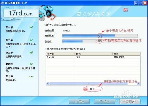 设置完以后点击“下一步”进入如图7所示的界面,到这里说明提取工作已经开始了,我们需要耐心等待,因为这里可能需要比较长的一段时间,这里需要注意的是在总体进度没有到100%以前,千万不要点击“停止”按钮,如果点击就可能使提取的歌曲不完整或者损坏光盘。