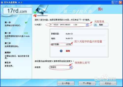 这个界面我们要设置提取出来的音频文件的格式,其实就是把音乐CD里面的文件进行了转换,这里我们一般设置为MP3格式,因为MP3格式的音频文件播放质量比较好,当然也可以根据你的爱好设置成图3上显示的其它格式。