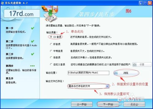 看完以后点击下一步进入如图6所示的界面,这一步主要是输出的音频质量和存储路径的设置,由于CD音质的体积比较大,如果我们在电脑上播放就设置成“CD音质”,如果在手机等移动设备上播放就选择体积比较小的音质选项。“输出位置”根据自己的使用习惯选择就可以了,其它的可以保持默认选项。