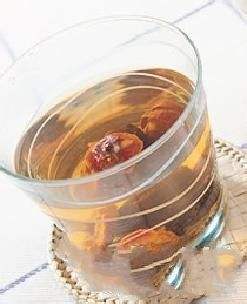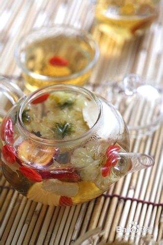做法:用刀轻轻地敲开桂圆的壳,取肉备用。将山楂,菊花,枸杞用清水冲洗一下。将山楂,菊花,枸杞,桂圆和西洋参片放入壶中,倒入开水,盖上盖子焖5分钟后调入蜂蜜搅匀即可。