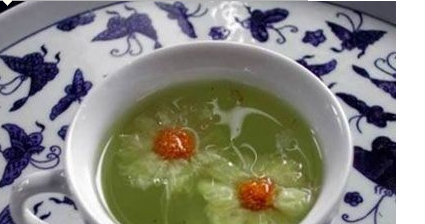 绿豆菊花茶材料:绿豆沙30克、菊花10克、柠檬10、蜂蜜少许。 做法:将菊花放入水中煮沸,然后将柠檬汁和绿豆沙汁注入菊花水中搅拌,最后放入少量蜂蜜即可饮用。