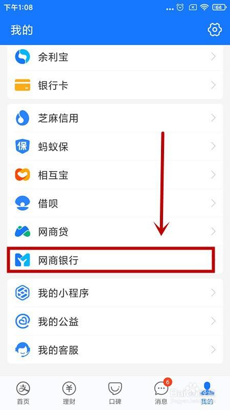 进入【我的】页面后,上滑屏幕,找到【网商银行】选项点击。