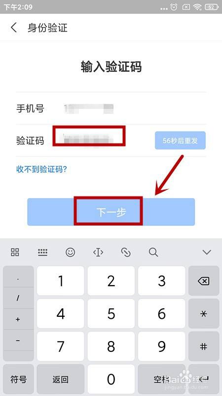 弹出【身份验证 】页面后,填写手机验证码 后,点击【下一步】。