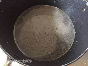 将黑芝麻粉浆放入锅里,加55g细砂糖中火加热至稍微浓稠状态