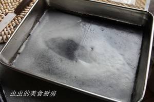 在蒸锅中放入蒸盘(底部刷少量玉米油),大火将水烧开,倒入适量的黑芝麻生熟浆(我是倒了1/3),加盖大火蒸4-5分钟。刚开盖的蒸熟的黑芝麻层表面会鼓泡,而且颜色从灰色变成黑色