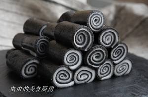 将蒸好放凉的芝麻皮从宽的一侧的边上往中间慢慢卷起,尽量卷紧一些,静置半小时至1小时;