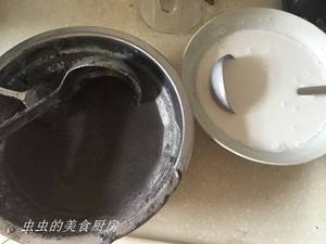 将黑芝麻熟浆趁热和马蹄粉生浆拌匀,如果还是液态,可以稍微加热,做成黑芝麻生熟浆;70g马蹄粉加250ml椰浆、100ml清水、50g白砂糖调成椰浆粉浆,这部分可以煮生熟浆,偷懒不煮也可以。