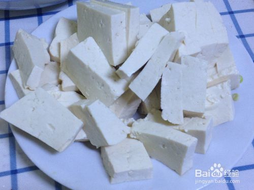 豆腐切成方块,备用。