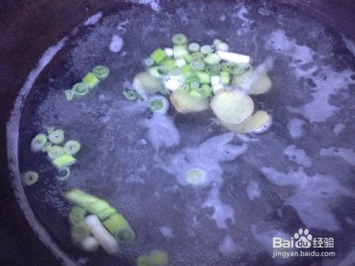锅烧热,放入清汤。加入葱段、姜片。大火。