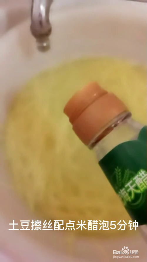 我们将土豆丝削皮切丝,放入清水中,加入白醋浸泡五分钟,这样土豆丝更清脆