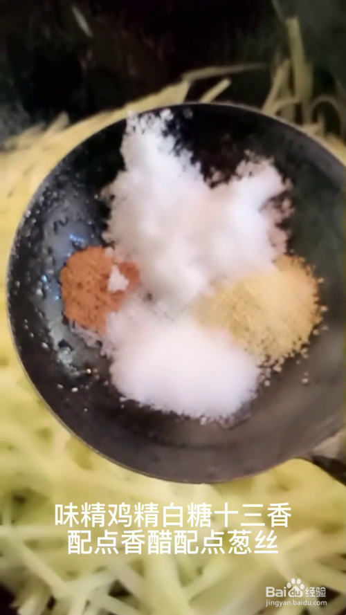 锅中烧油,油热下入土豆丝快速翻炒,再放入盐,鸡精,白糖,十三香,香醋