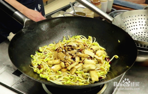 老豆腐一块,切成片;适量的黄豆芽,用清水淘洗干净备用。