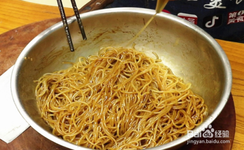 把粉条捞出来,淋上老抽拌匀,提前上色以免后期炒出来颜色不均匀,再淋一些植物油防止粉条相互粘连坨块,这是饭店炒粉条经常用的一招,弹润爽滑、还不粘不坨。粉条有点长了,我们把它剪断、方便食用。
