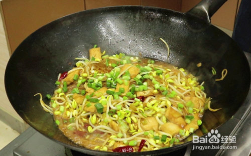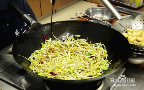 锅内再烧油,加入一小块猪油增香,放入葱姜爆香,撒入几粒干辣椒、两粒八角,小火煸炒出香辣味,倒入黄豆芽转大火颠锅翻炒,把豆腥味炒出去,淋入生抽提鲜,把黄豆芽炒至断生。