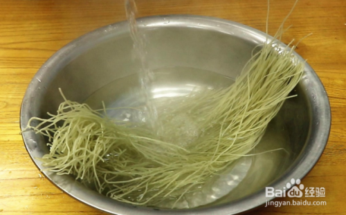 首先,我们把粉条用温水泡上,最好用河南本地的红薯粉、爽滑还筋道,泡软就可以了,带着一点硬芯,这样煮的时候才不容易断。