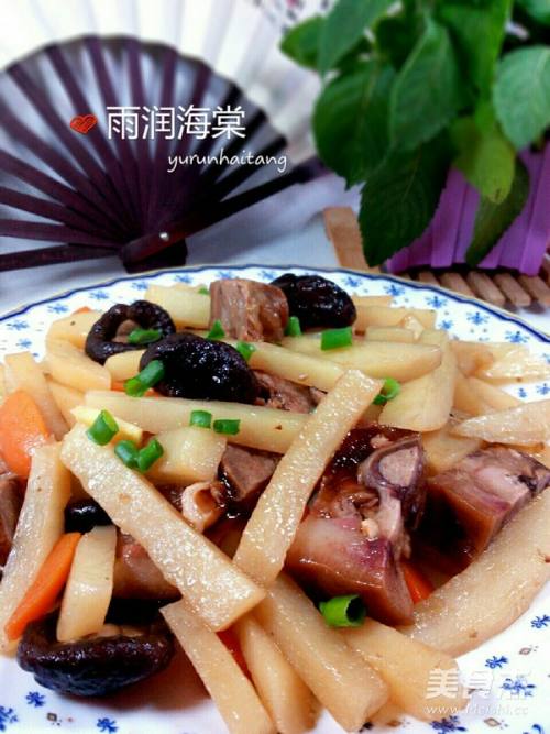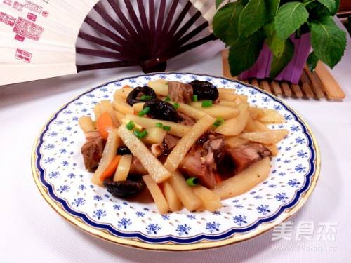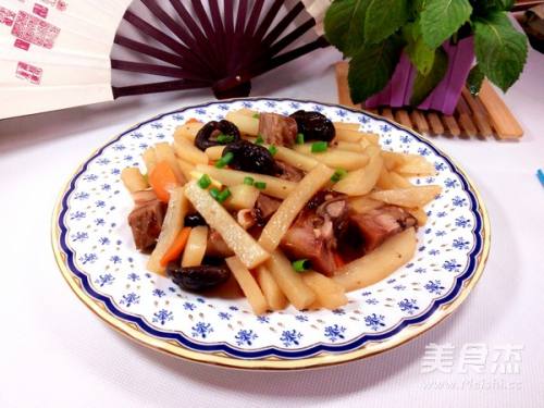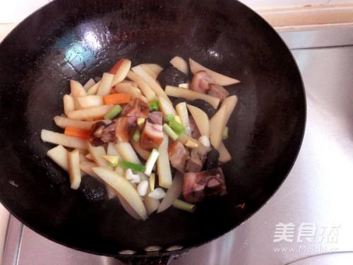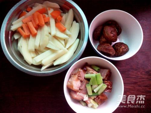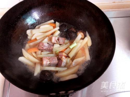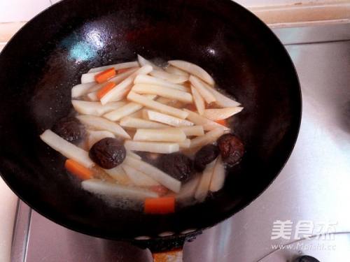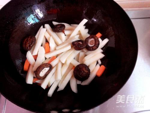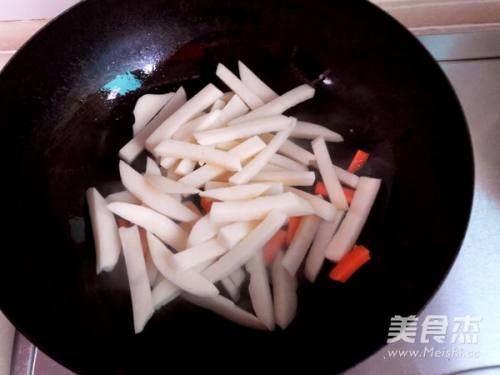 热锅放油,放入土豆条和胡萝卜翻炒几下