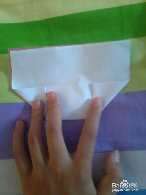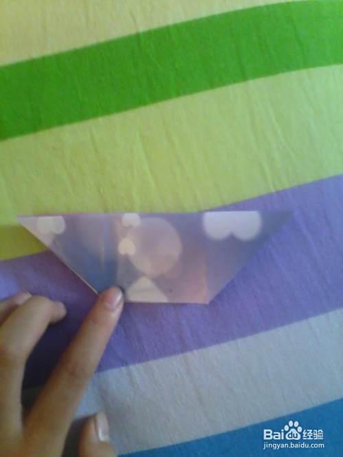 将纸的下角依折痕折两个小三角,上角用上半面折两个三角,记住要依折痕。