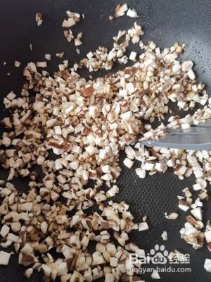锅内放少许油,油热后倒入香菇丁翻炒,同时倒入适量料酒和生抽。