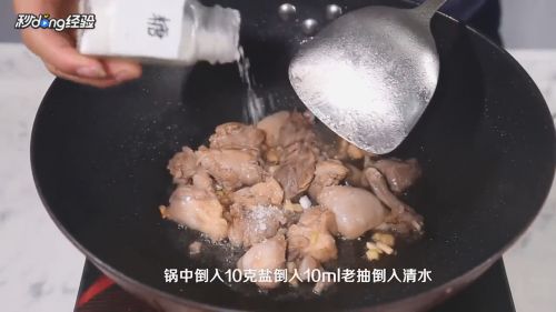 5放入鸭腿翻炒均匀后,锅中倒入10克盐,倒入10毫升老抽,倒入清水。