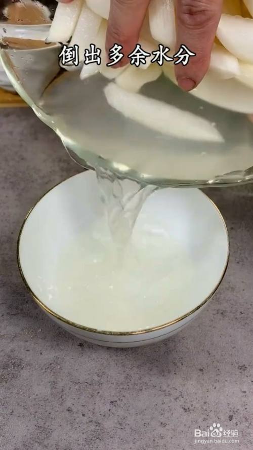 500g萝卜切条,放入碗中,加入20g白糖,抓拌均匀,腌出水,到出水分,清水浸泡,挤干水分