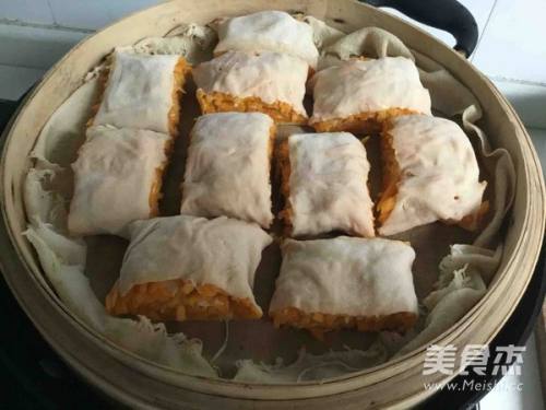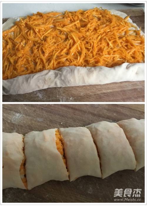3放均匀南瓜丝的面皮,用手从一边卷起,卷好的南瓜卷用刀切成小段
