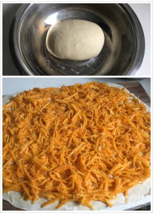 2凉水和面 醒20分钟,用擀杖把面团擀成薄面皮,调味好的南瓜丝均匀的放在面皮上