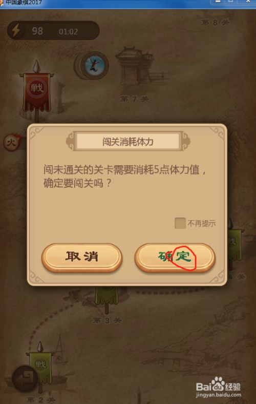 进入到七关,系统提示要消耗五点体力,点确定就进入第七关闯关界面。用马将军,黑方帅往上走。