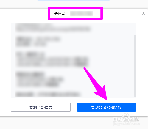 弹出会议号的对话框,可以在顶部看到,点击复制会议号和链接可以邀请他人参与会议。