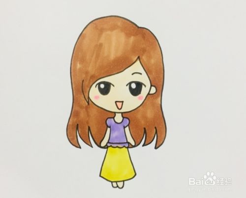 最后将上衣用紫色涂上,裙子则涂上黄色,漂亮的女孩子就画好啦。