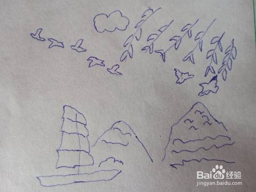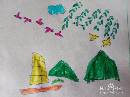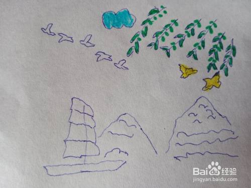 画出山代表窗含西岭千秋雪。画一个船,代表门泊东吴万里船。