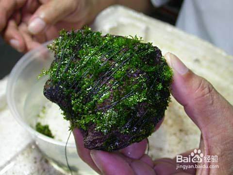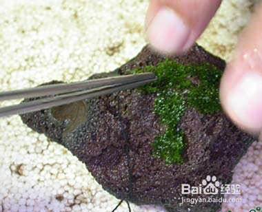 用镊子在火山石上一点一点的平铺上珊瑚莫丝。一定要小心点,不要弄的太碎。