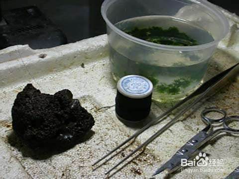 珊瑚莫丝易碎,所以绑的时候,需要十分的小心。拿火山石来当做基石(也可以选择一般的石头)。还有镊子,剪刀,都要备上。当然还有喷水壶。小心处理。