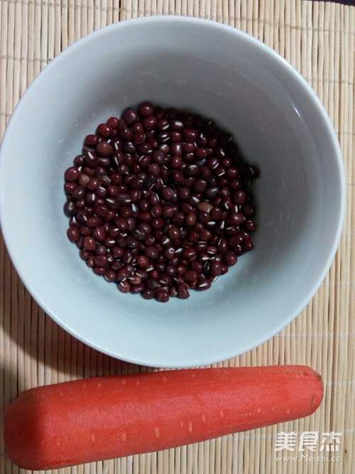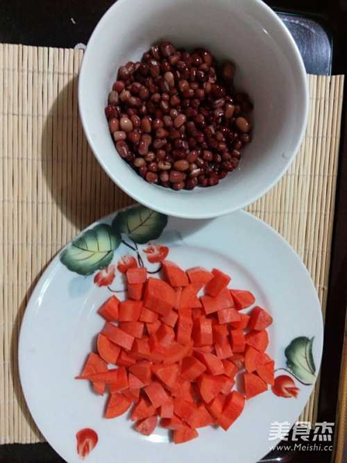 红萝卜切丁,捞出泡好的豆子。