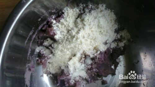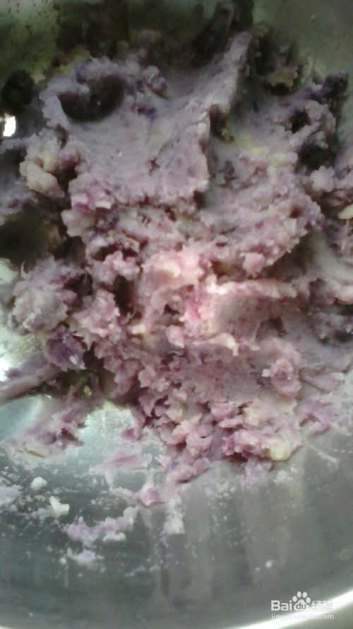 把熟了的土豆和紫薯 搅拌成泥状,搅拌的时候不要忘了加糖