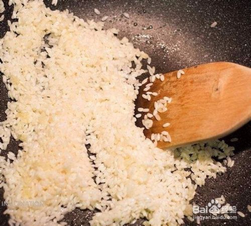 油热之后放入大米粒,用铲子搅拌均匀。(放入大米粒的时候就要改成大火,是为了让米粒迅速受热膨胀)