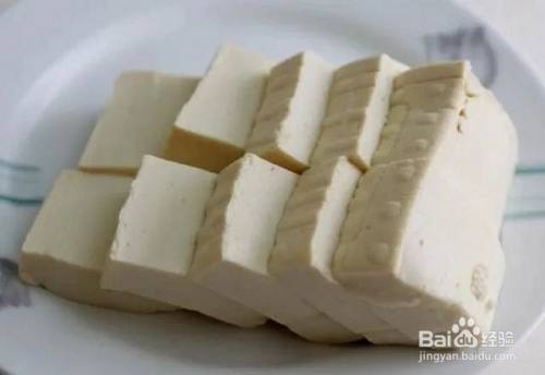 2.豆腐先一切二,再切厚片。