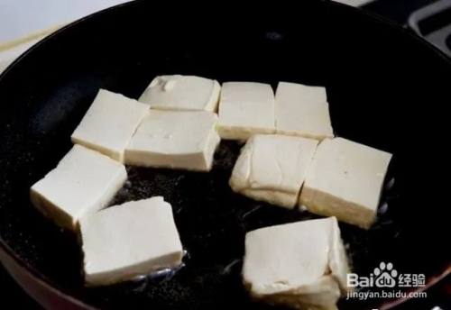 3.锅里多倒些油,油温热下豆腐,在豆腐表面稍撒点盐,用中小火煎到两面黄盛出。