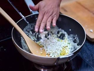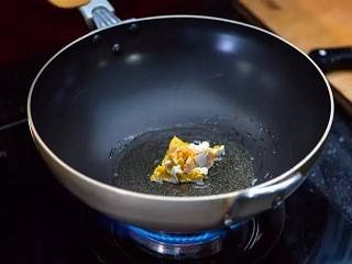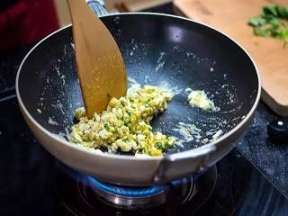 锅内倒入色拉油,加热,放入咸蛋黄、香葱和大蒜,炒香。